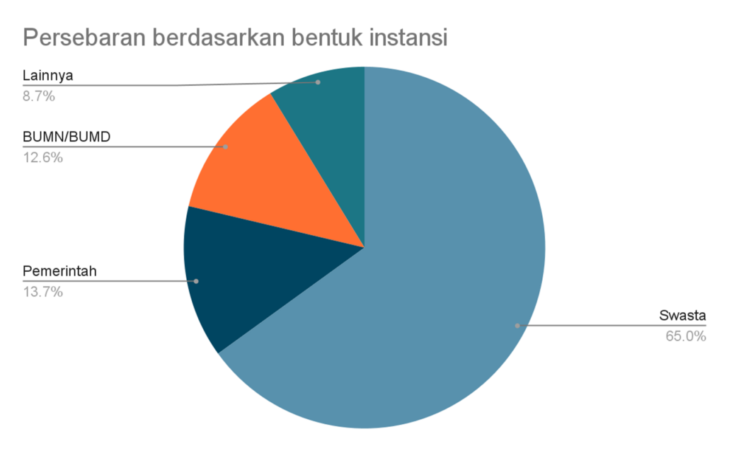 Dari sisi bentuk instansi, 65,03% lulusan bekerja di perusahaan swasta. Sebanyak 13,66% berkarier di instansi pemerintah (PNS/Dinas), dan 12,57% diterima di BUMN/BUMD. Sementara itu, 1,09% bekerja di organisasi multilateral, 1,64% di organisasi non-profit/LSM, dan 6,01% di sektor lainnya. Data ini memperlihatkan lulusan dapat beradaptasi pada berbagai bentuk instansi.