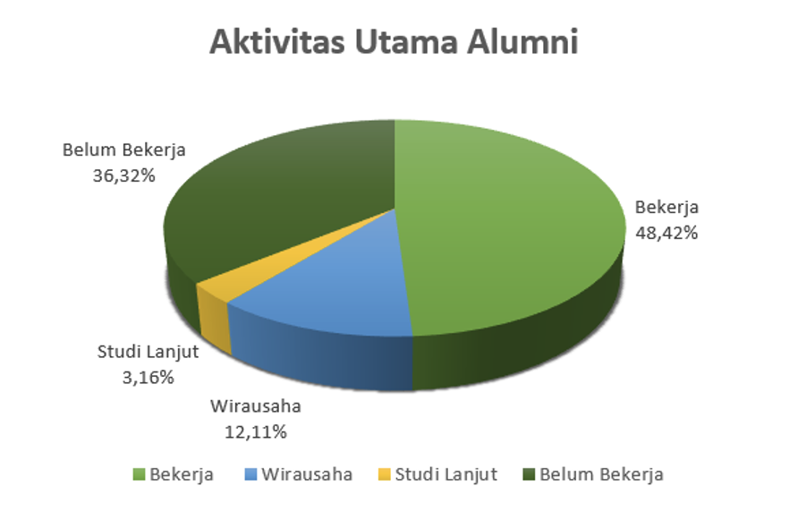 Berdasarkan data aktivitas utama, sebanyak 48,42% atau 92 alumni S1 Ilmu Komunikasi UII tercatat telah bekerja. Sementara itu 12,11% (23 alumni) memilih untuk berwirausaha, 3,16%  (6 alumni) memilih untuk melanjutkan studi, dan 36,32%  (69 alumni) lainnya masih belum bekerja serta masih dalam proses mencari pekerjaann
