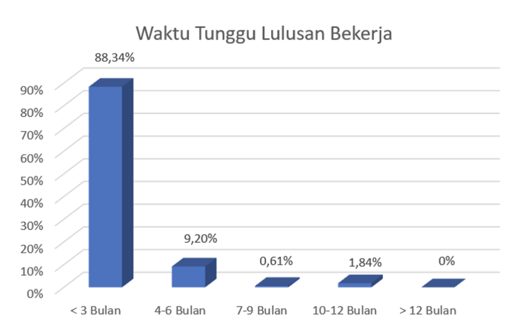 Sebagian besar alumni Program Studi Ilmu Komunikasi mampu memperoleh  pekerjaan dalam waktu yang relatif singkat, yaitu kurang dari tiga bulan setelah lulus. Tercatat bahwa terdapat 88,34% (80 alumni) mendapatkan pekerjaan dalam waktu kurang dari tiga bulan, sementara 9,20% (8 alumni) dalam rentang waktu 4–6 bulan. Selain itu terdapat 0.61% (1 alumni) yang memperoleh pekerjaan dalam waktu 7–9 bulan dan 1,84% dalam rentang waktu 10–12 bulan, serta tidak terdapat alumni yang memperoleh pekerjaan lebih dari 12 bulan setelah lulus. Secara statistik, rata-rata waktu tunggu kerja alumni Program Studi S1 Ilmu Komunikasi tercatat sekitar 3,20 bulan dengan median tiga bulan.