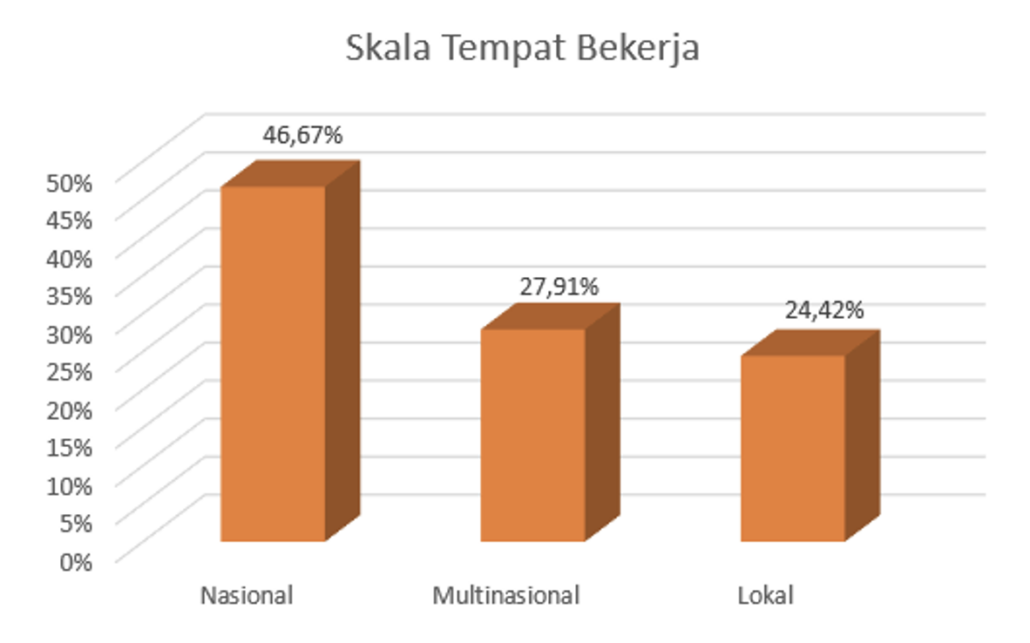 Dilihat dari skala perusahaan tempat bekerja, sebagian besar alumni Program Studi S1 Ilmu Komunikasi  bekerja pada perusahaan berskala nasional dengan presentase sebesar 46,67%. Selanjutnya 27,91% bekerja di perusahaan multinasional, dan 24,42% bekerja di perusahaan berskala lokal. Hal ini menunjukkan bahwa lulusan S1 Ilmu Komunikasi memiliki peluang yang luas untuk berkarier tidak hanya di tingkat lokal, tetapi juga di tingkat nasional hingga internasional.