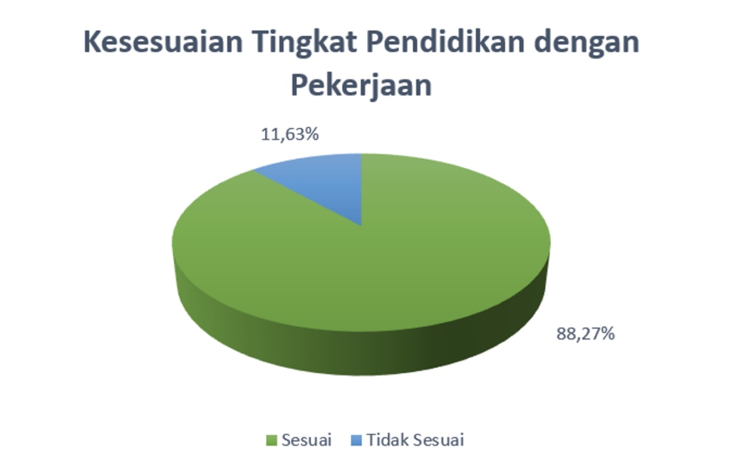 Tracer study ini juga dilakukan untuk mengetahui kesesuaian tingkat pendidikan dengan pekerjaan alumni. Berdasarkan hasil survei terhadap 86 responden alumni Program Studi Ilmu Komunikasi  tercatat bahwa tingkat kesesuaian antara pendidikan dan pekerjaan tergolong tinggi. Sekitar 88,27% atau 76 responden menyatakan bahwa tingkat pendidikan mereka sesuai dengan pekerjaan yang dijalani, sedangkan 11,63% atau 10 responden lainnya bekerja pada bidang yang tidak sepenuhnya sesuai dengan tingkat pendidikan mereka.