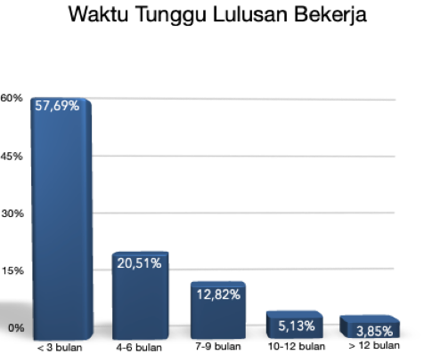 Keunggulan daya saing alumni terlihat dari waktu tunggu lulusan bekerja, dengan proporsi sebesar 57,69% alumni berhasil mendapatkan pekerjaan dalam waktu kurang dari tiga bulan setelah kelulusan. Sebanyak 20,51% mendapatkan pekerjaan dalam rentang waktu 4-6 bulan, dan 12,82% lulusan dalam waktu 7-9 bulan. Persentase lulusan yang memperoleh pekerjaan dalam rentang 10-12 bulan tercatat sebesar 5,13%, sedangkan 3,85% lulusan membutuhkan waktu lebih dari 12 bulan. Ini menunjukkan bahwa mayoritas lulusan memiliki daya saing yang relatif tinggi di pasar kerja, di mana lebih dari 75% alumni sudah terserap di dunia profesional dalam waktu kurang dari 6 bulan setelah lulus.