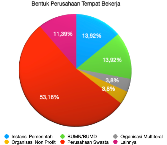 Dari sektor perusahaan tempat bekerja, sebagian besar lulusan S1 Informatika UII berkarier di perusahaan swasta dengan angka mencapai 53,16% lulusan, di BUMN/BUMD dan instansi pemerintah dengan proporsi yang sama sebanyak 13,92% lulusan. Sementara itu, lulusan bekerja di organisasi multiteral dan organisasi non profit masing-masing 3,80% lulusan dan 11,39% lulusan bekerja di kategori lainnya. Komposisi ini mencerminkan keberagamaan pilihan karier lulusan S1 Informatika di berbagai sektor.