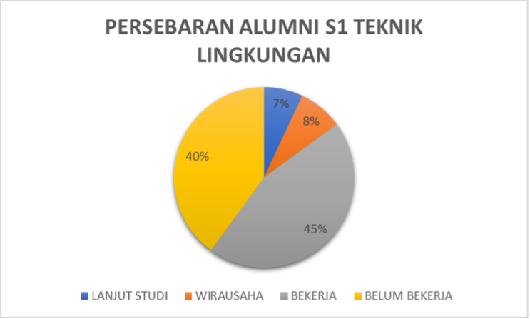 Persebaran lulusan S1 Teknik Lingkungan menunjukkan bahwa sebagian besar alumni telah memasuki dunia kerja. Sekitar 45% dari jumlah alumni telah memulai karir mereka di berbagai sektor, mulai dari instansi pemerintah hingga perusahaan swasta, baik nasional hingga internasional. Sementara itu, sekitar 40% lulusan masih dalam tahap pencarian kerja pada saat survei dilaksanakan. Sebanyak 8% dari total lulusan memilih untuk mengembangan usaha secara mandiri. Adapun sekitar 7% diantaranya memutuskan untuk melanjutkan studi ke jenjang yang lebih tinggi.