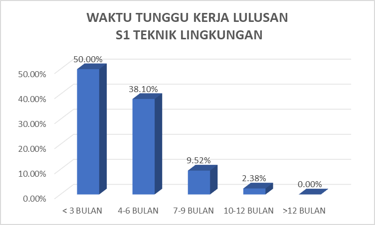Keterserapan lulusan S1 Teknik Lingkungan di dunia kerja menunjukkan hasil yang positif. Hal ini dikorelasikan dengan masa peralihan lulusan ke dunia kerja yang relatif singkat. Mayoritas lulusan S1 Teknik Lingkungan hanya membutuhkan waktu kurang dari 3 bulan untuk memulai karir pertamanya di dunia kerja dengan persentase sebanyak 50.00%. Sementara itu, sekitar 38.10% lulusan mulai bekerja dalam rentang waktu 4-6 bulan. Adapun 9.52% lulusan membutuhkan waktu 7-9 bulan untuk memulai karir pertamanya, dan hanya 2.38% dari total lulusan yang membutuhkan waktu tunggu hingga 10-12 bulan. Secara keseluruhan, tidak terdapat alumni yang membutuhkan waktu lebih dari 12 bulan untuk memulai mendapatkan pekerjaan pertamanya.