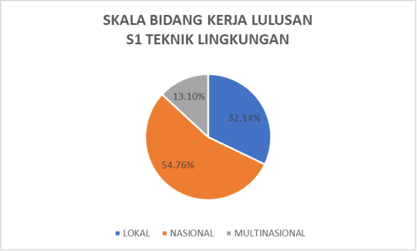 Keterserapan lulusan S1 Teknik Lingkungan, tidak hanya terbatas pada tingkat lokal atau nasional, tetapi juga terserap di tingkat internasional. Tercatat sekitar 32.14% lulusan bekerja di instansi/perusahaan lokal. Di tingkat nasional, keterserapan lulusan relatif tinggi, sebesar 54.76%. Sementara itu, 13.10% dari total lulusan terserap di tingkat internasional. Meskipun keterserapan lulusan di tingkat internasional cenderung sedikit dibandingkan dengan lulusan yang terserap di tingkat lokal dan nasional, ini menunjukkan relevansi dan kesiapan kurikulum yang dimiliki program studi S1 Teknik Lingkungan untuk bersaing di tingkat global.
